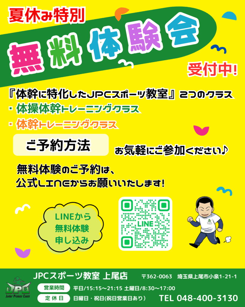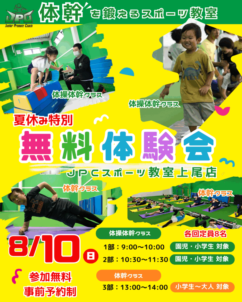 JPCスポーツ教室上尾店では、8月10日(日)『夏休み特別無料体験会』を開催します