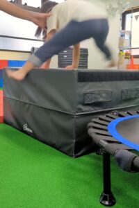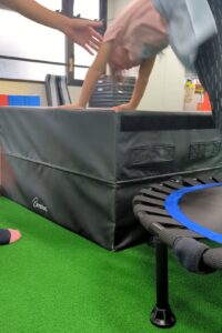 跳び箱を跳ぶ上での正しい姿勢をつくるために腕を伸ばした状態でトランポリンを用いてお尻を高く上げる、できたら脚を開いて座ってみるというトレーニングです。