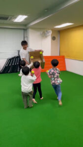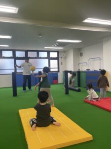 逃げ玉入れ 目標物が動くことで注意の切り替え、ルール理解にも繋がります! 体操教室だけどこういった遊びの時間も大事にしています!