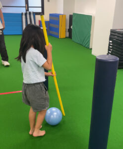 ボールコントロール! マットから落ちないように意識したり、ポールに当たらないようにしたりビジョントレーニングにもなります。 体操教室で体幹をしっかり強化!厚木の JPCスポーツ教室厚木店(海老名・座間...
