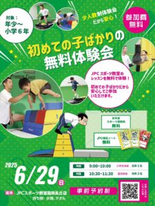 6月29日(日)に無料体験会を開催致します! ※非会員様向けのイベントとなります。 初めての子ばかりで少人数での体験会のため、初めての場所では緊張してしまうお子様にもおすすめです! 日程:6月29日(日) 場所:JPCスポーツ教室福岡長丘店 時間:【1部】9:00〜10:00 【2部】10:30〜11:30 対象:【1部】小学生 【2部】年少さん〜年長さん 定員:各部5名 持ち物:飲み物、タオル ご参加は事前予約制になります! 少人数での体験会のため、ご参加をご希望の方はぜひお早めにお申込みください