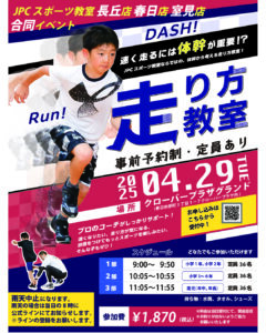 会 場:クローバープラザグラウンド (春日市原町3-1-7 クローバープラザ内) ※雨天時は中止となります 時 間:〈1部〉9時00分~9時50分(小学1・2年生) 〈2部〉10時05分~10時55分(小学3~6年生) 〈3部〉11時05分~11時55分(年中・年長さん) 定 員:各部36名 持ち物:水筒、タオル、走りやすいシューズ 参加費:1,870円 ※参加費は当日に現金で徴収致します。お釣りが出ないようご協力をお願い致します。 毎回好評の走り方教室を今回は広々としたグラウンドで開催します! ・お子様の走り方が気になる ・足が速くなりたい ・自信をつけてもっとスポーツを楽しみたい 当てはまる方はぜひこの機会に正しい走り方を学んでみませんか? ご参加は事前予約制となります。 お申込みはこちら