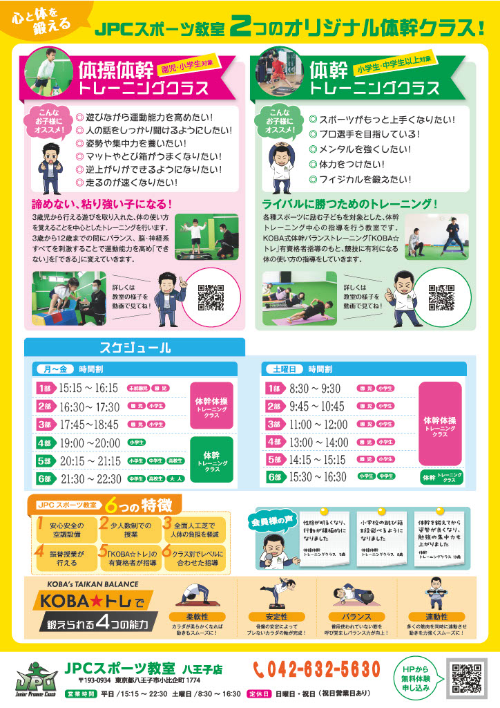 JPCスポーツ教室八王子店は下記日時で無料見学会・体験会を開催いたします。