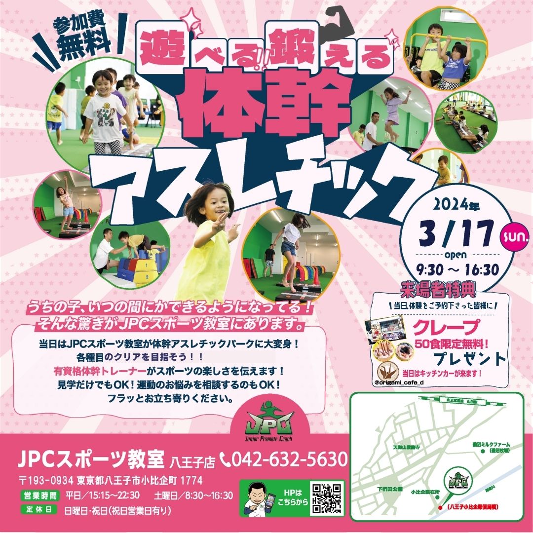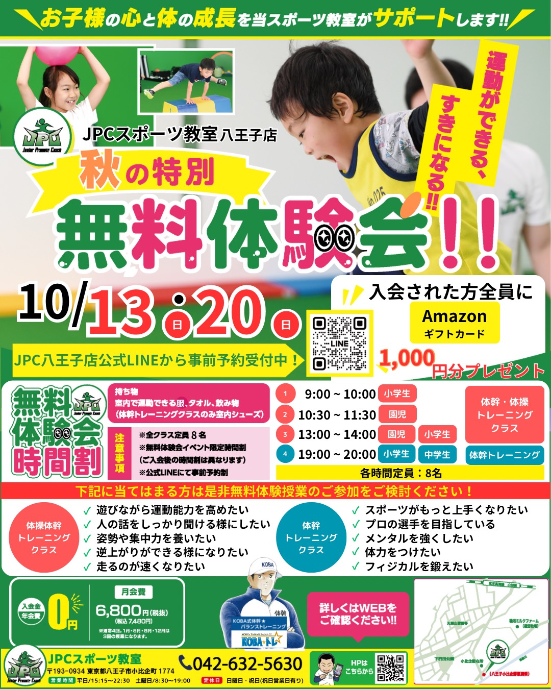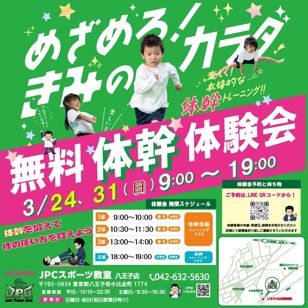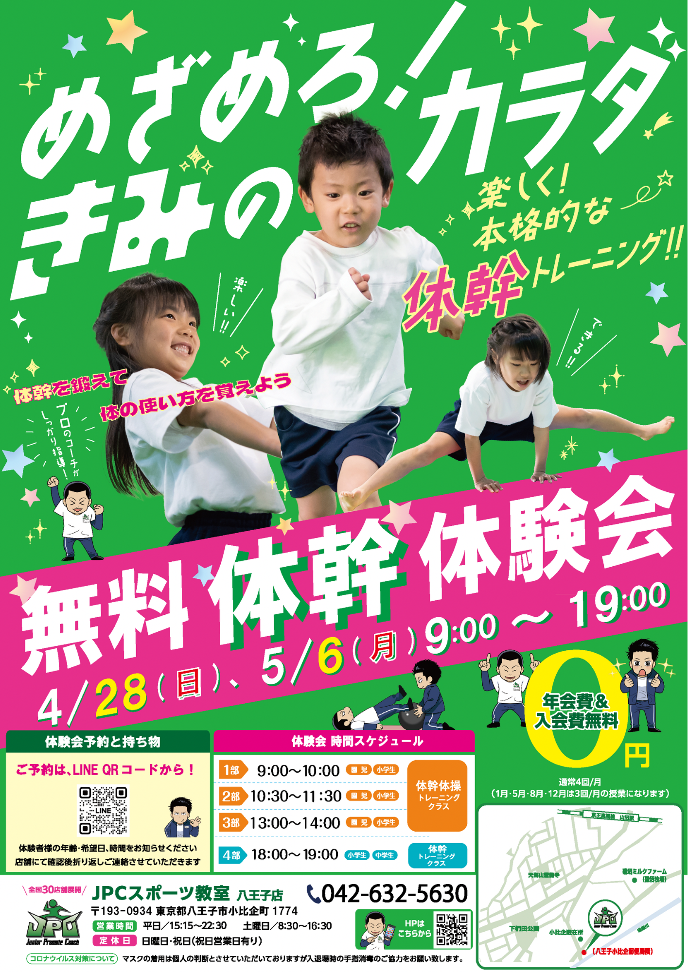 JPCスポーツ教室八王子店では、新年度準備の無料体験毎日実施中です。 お問い合わせお申込みはこちらの公式LINEからも承れます。 <体操体幹クラス> 平日 15:15~16:15 未就園児・園児 ...
