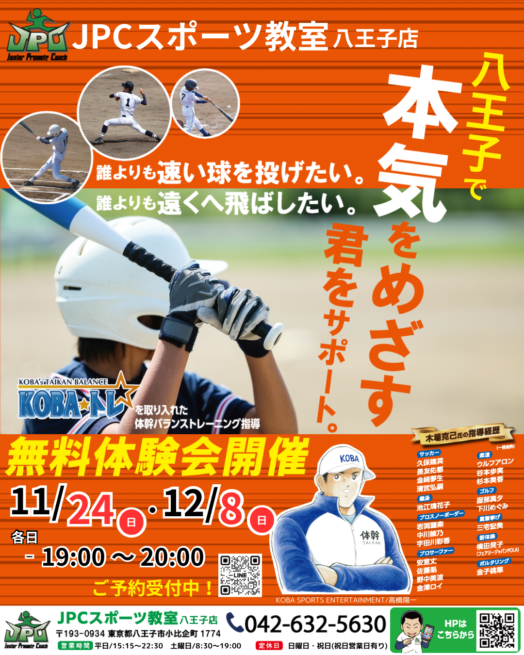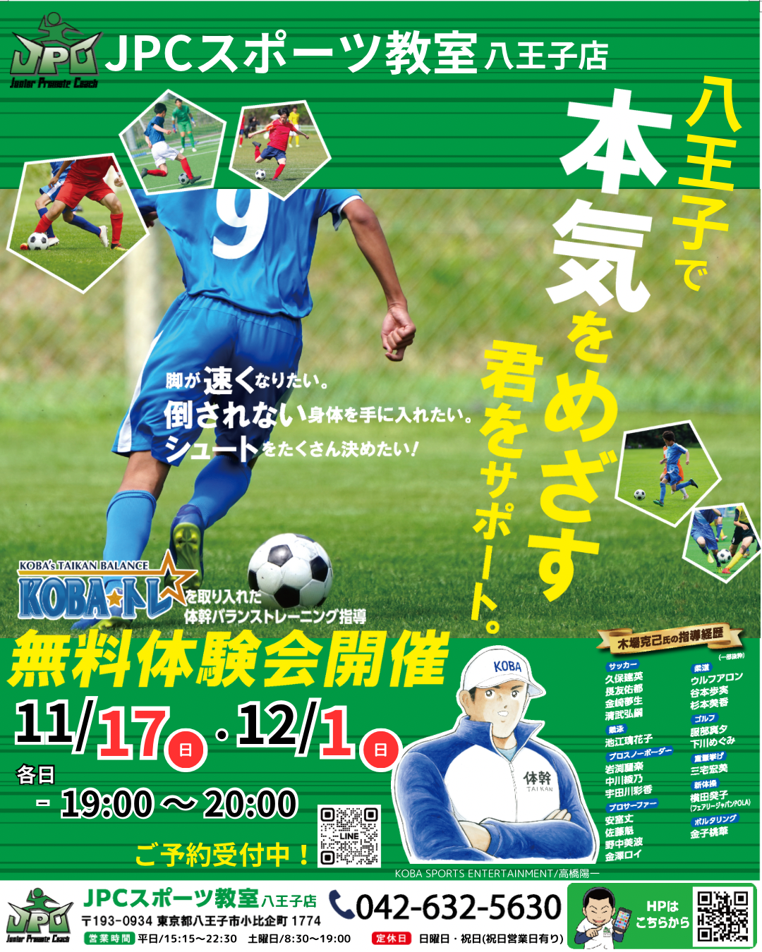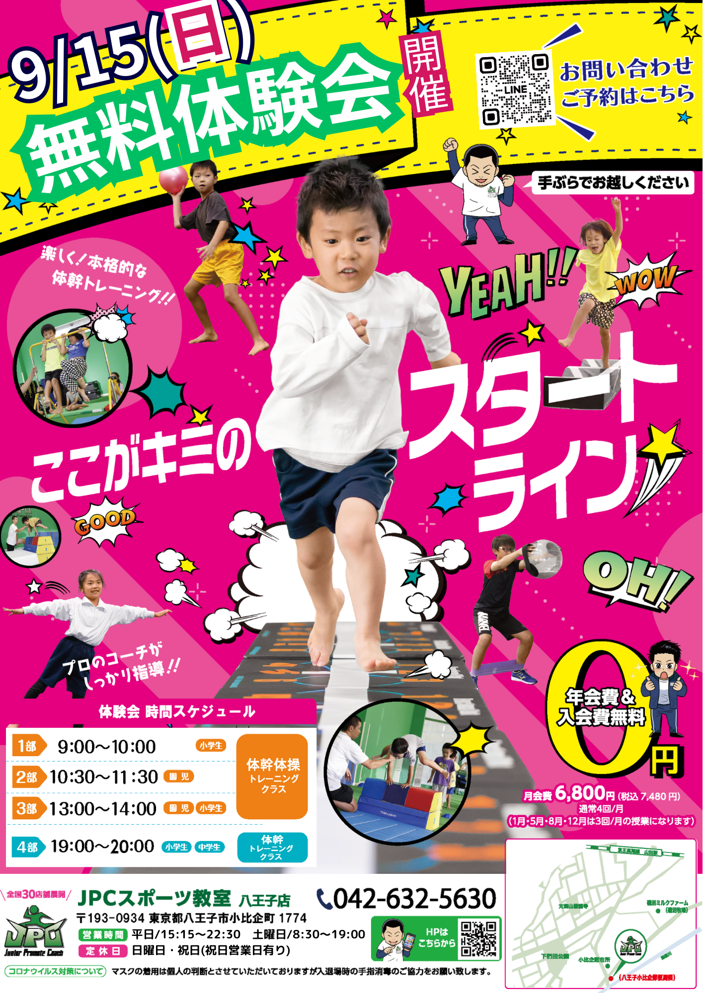 JPCスポーツ教室八王子店では、新年度準備の無料体験毎日実施中です。 お問い合わせお申込みはこちらの公式LINEからも承れます。 <体操体幹クラス> 平日 15:15~16:15 未就園児・園児 ...