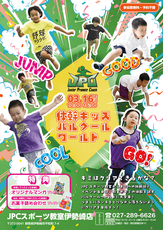 title="開催日時:2025年2月16日 10:00~16:00 開催場所:JPCスポーツ教室伊勢崎店 開催住所:群馬県伊勢崎市平和町7番地4 駐車場:あり 料金:無料 電話番号/027-289-6626 お問合せLINE:https://lin.ee/3DmM5iF"