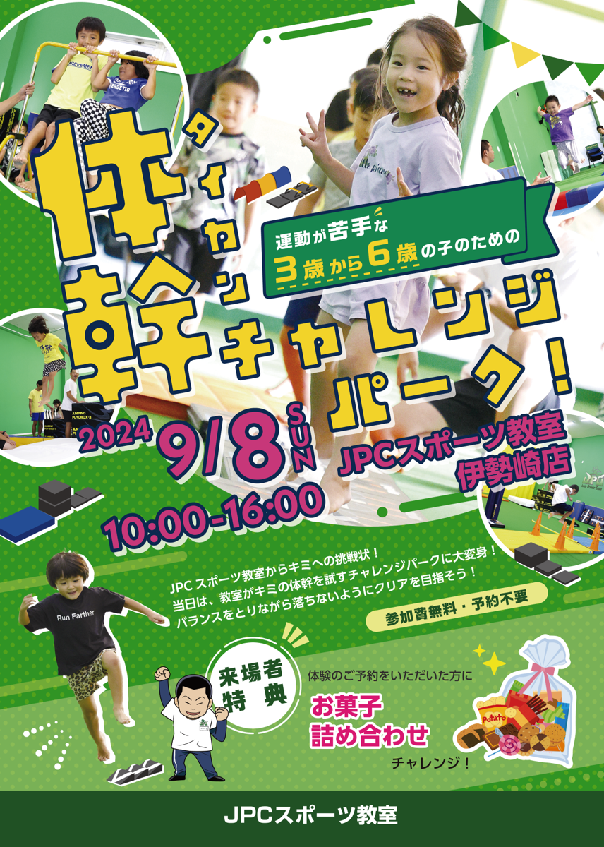 こんにちは! JPCスポーツ教室伊勢崎店のりひとコーチです⭐   9月に入りましたがまだまだ残暑が厳しいですがいかがお過ごしでしょうか?? 先日の日曜日(9/8)の体幹チャレンジパークイベントでは、た...