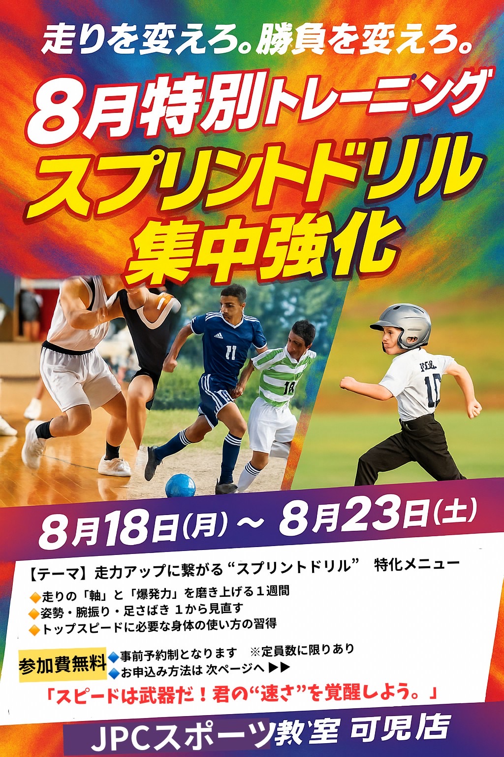 こんにちは!JPCスポーツ教室可児店です! 8月18日(月)〜8月23日(土)の1週間走力に特化した特別トレーニングを行います! 🟥走りの軸と瞬発力を磨き上げる1週間 🟥姿勢・腕振り・足さばきを1から...