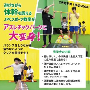 是非お越しください♪ 近くに住んでるけどどんな教室なのかな❓ うちの子運動苦手なのよね❓ スポーツに体幹は必要って言うけど体幹って…❓ などなど、気になることがあれば是非イベントでお待ちしております! ◎運動が苦手なお子様 ◎猫背や走るフォームが気になるお子様 ◎体の使い方を学びたいお子様 \JPCで体操を習いませんか?😊/ ◎部活やクラブチームでの成績を上げたいお子様 ◎ライバルに差をつけたいお子様 ◎怪我をしにくい身体を作りたいお子様 \JPCで体幹トレーニングをしませんか?/ 当日のご予約は不要でございます。 お近くにいらっしゃる際にお気軽にお立ち寄り下さい🥰 イベントまで待てないという方には事前の無料体験も可能です👍 通常クラスには定員がございますのでご希望の日付の体験ご予約はぜひお早めに✨