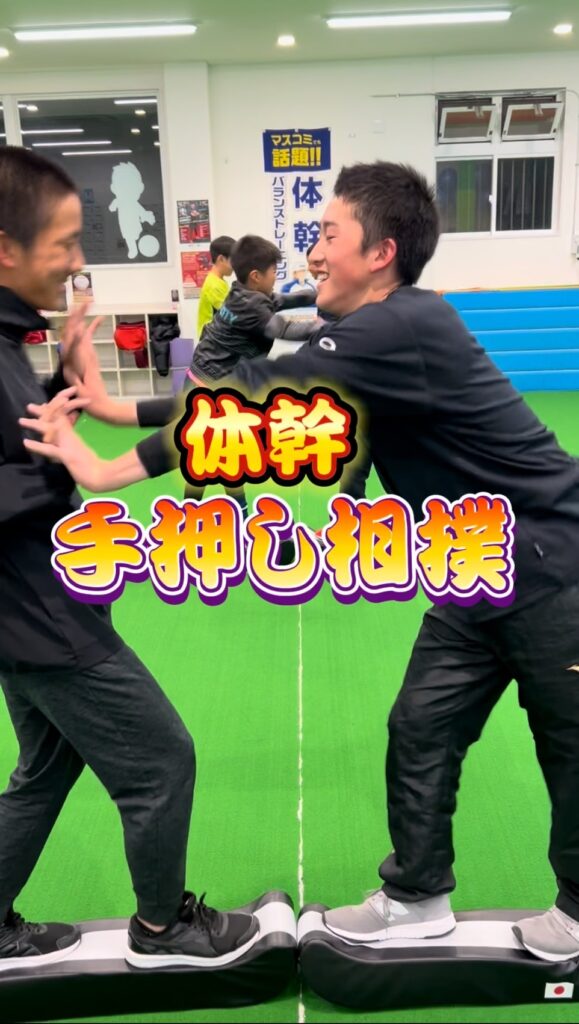 体幹手押し相撲🖐️💥🤚今回紹介するのは体幹手押し相撲です!かかとにつま先をくっつけた状態で行うとバランスが取りづらくなり、倒れないようにお腹で耐えます!⭐️必然的に体幹部へ刺激が入り、体幹を鍛えながら...