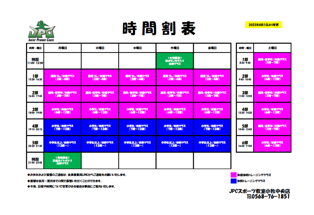4月から時間割表が変わります HPの反映は4月からになるため 上記日程表を参照ください 人気の小学生体操クラスが土曜日に追加されます😎 すぐに埋まってしまう人気のクラスなので要チェックです‼ 3月に入...