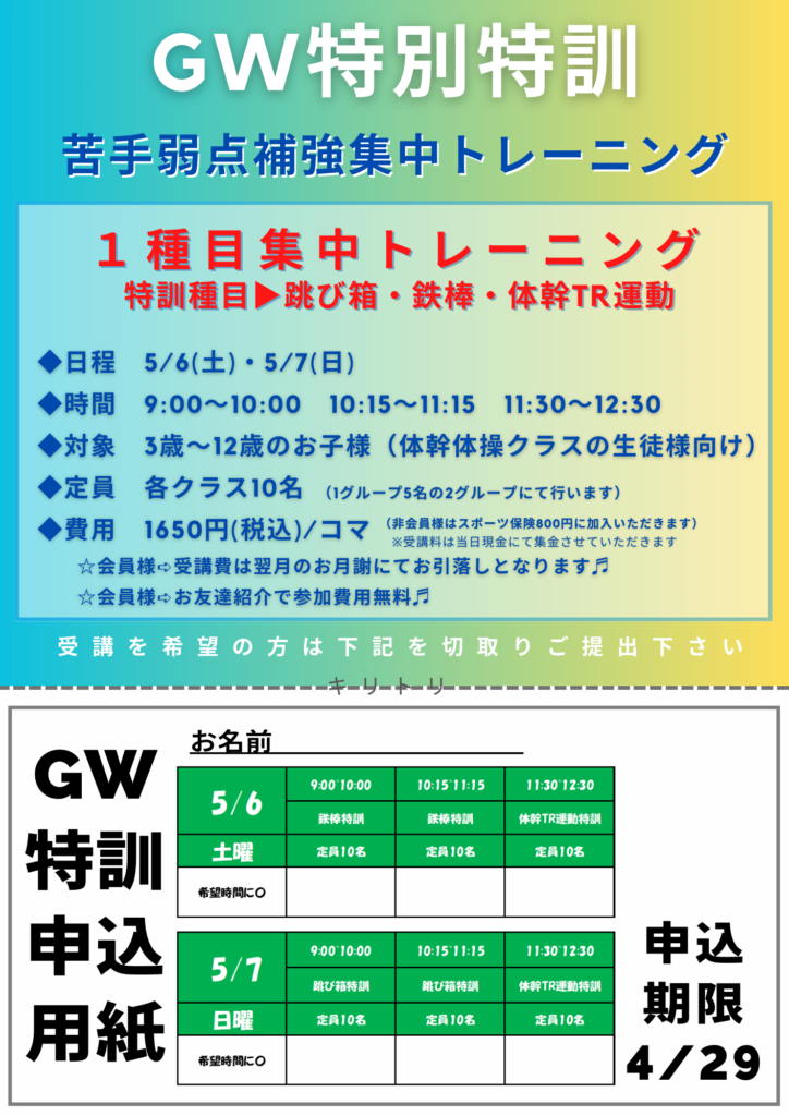 今年のGWは特別特訓を開催します✨✨✨特訓種目は『鉄棒』・『跳び箱』・『体幹TR運動』みんなからの声が多かったこの3種目を行います!(^^)!苦手を克服したい・もっと得意にしたい・GW暇だから動きたい...