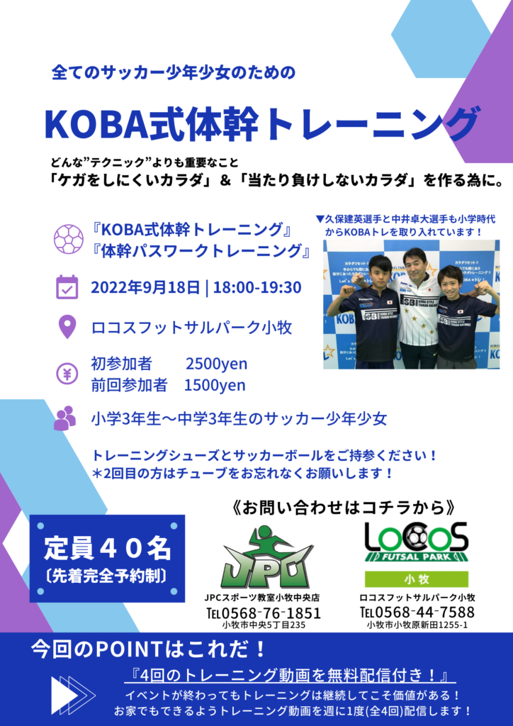 9月18日は ロコスフットサルパーク小牧に集合だ サッカー少年少女のための講習です! KOBAトレの体幹チューブメニューをやります! 股関節回りの柔軟性を高め 可動域を広げることで エネルギーをうまく...