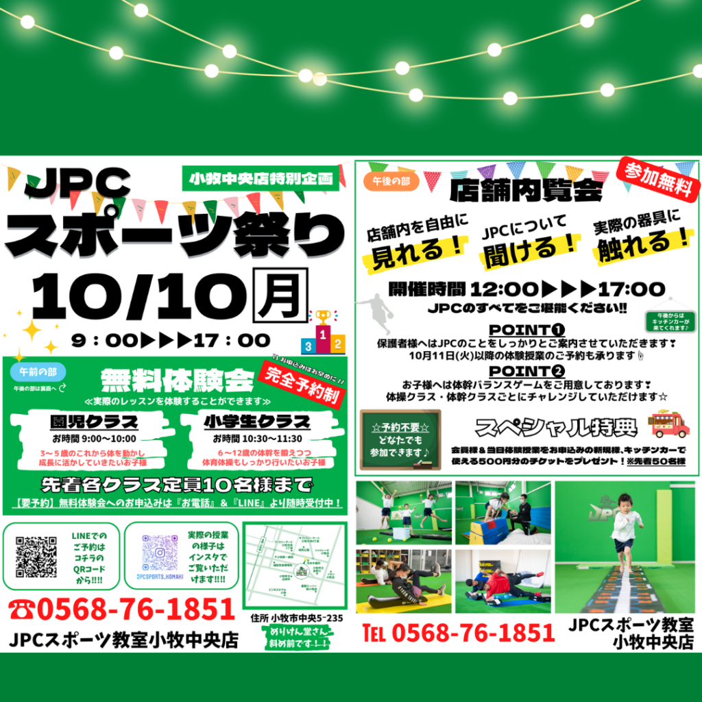 みなさんこんにちは! イベント情報です!  10月10日(月・祝)に【JPCスポーツ祭り】を開催いたします! 内容はこんな感じ♪ どなたでも参加可能ですのでぜひぜひ遊びにいらしてくださいね!たくさんの...