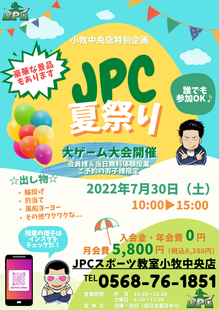 7月30日(土)JPC夏祭りを開催します♪ 夏といえば、、、 お祭りだー!!!! 7月30日(土)はJPCスポーツ教室小牧中央店で夏祭りを開催いたしますお子様から大人の方までみんなが楽しめる内容となっ...