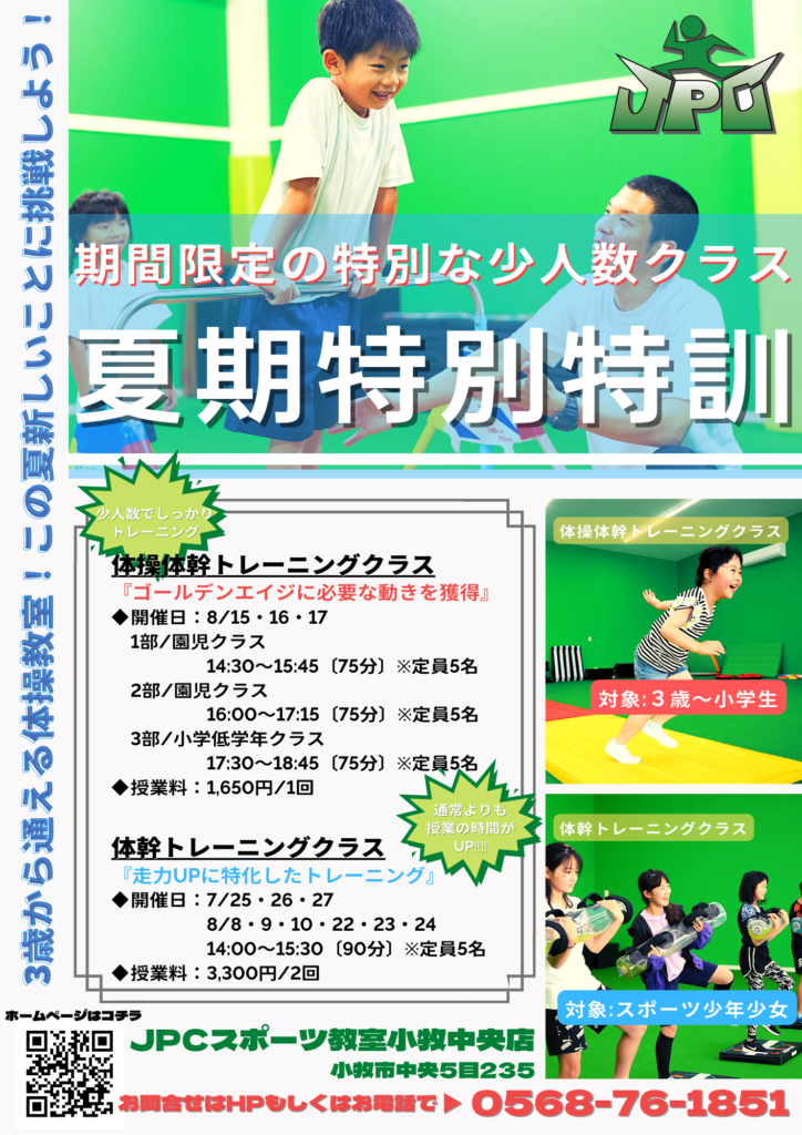 夏期特別特訓の受付がスタート! 夏期限定の特別クラスのご紹介🌻もうすぐ夏休み!長い暑い最高の夏休みがスタートですね!JPC小牧中央店では、夏休みにしかできない特別な授業をご用意いたしました!●園児・小...