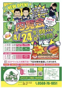みなさんこんにちは! JPCスポーツ教室小牧中央店です! 410オープンチラシ   4月10日(日)にOPEN内覧会を開催いたします✨ お時間は、9:00~20:00となっております✨   当日は体験...