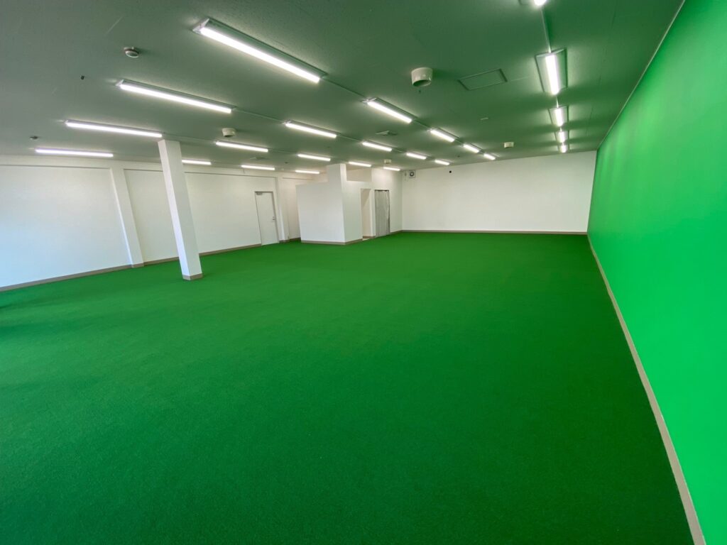 店内の床は全面転んでもいたくない人工芝で安心して運動ができます。