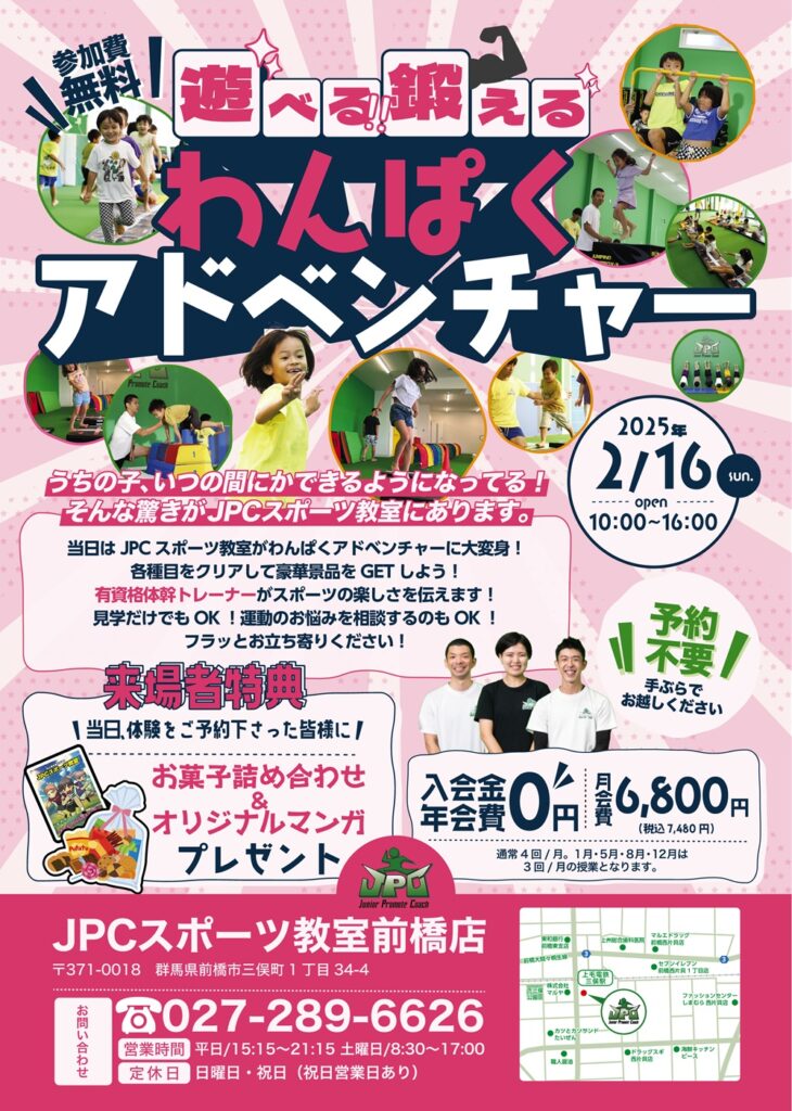 title="開催日時:2025年2月16日 10:00~16:00 開催場所:JPCスポーツ教室前橋店 開催住所:〒371-0018 群馬県前橋市三俣町1丁目34-4 駐車場:あり 料金:無料 お問合せ番号:準備中 お問合せLINE:https://lin.ee/8PMeM09"