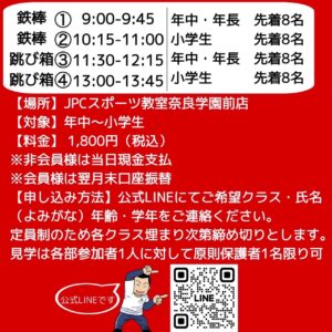 ■場所 : JPCスポーツ教室奈良学園前店 ■対象:会員様&非会員様 年中~小学生