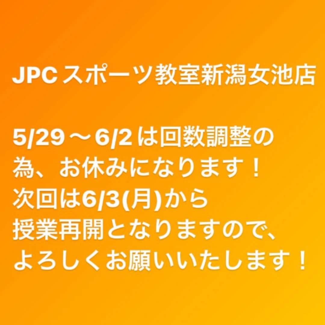 こんにちは🌟 JPCスポーツ教室新潟女池店の白崎です🦋 いつも女池店のHPをご覧いただきありがとうございます😊 5/29〜6/2は回数調整の為、お休みになっております! 休業期間にいただきましたお電話...