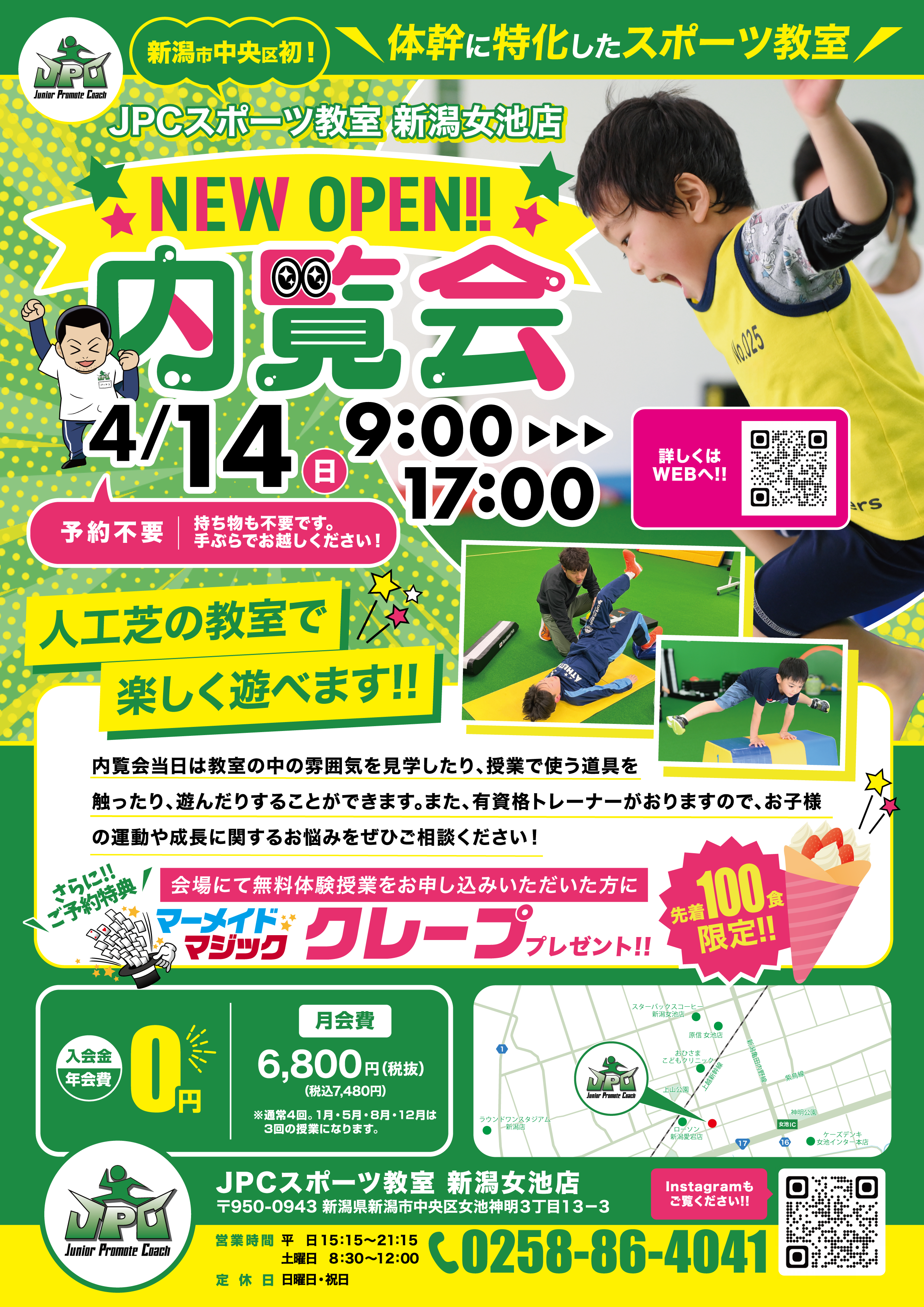 こんばんは🌛 JPCスポーツ教室女池店の白崎です! いつも女池店のHPをご覧いただきありがとうございます🎶 4月14日にJPCスポーツ教室女池店がOPENしました🌸 たくさんの方にご来場いただきありが...