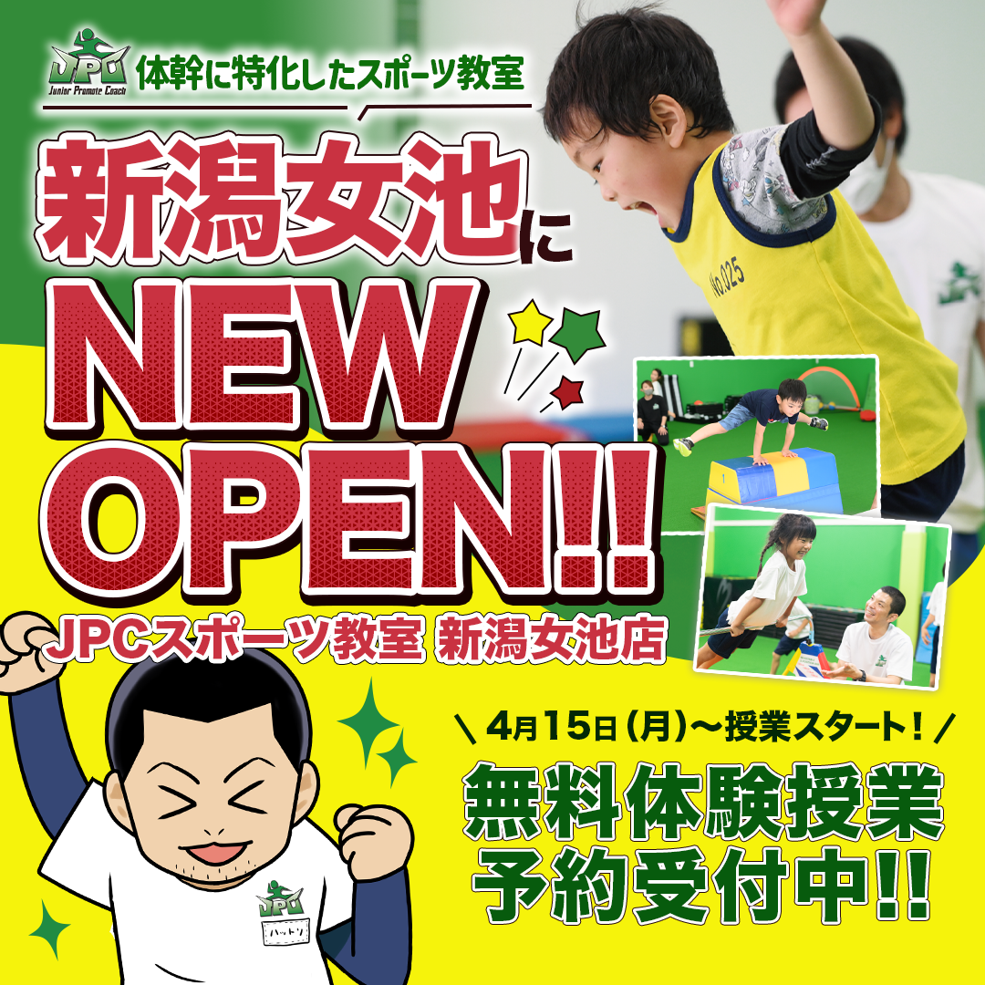 初めまして! JPCスポーツ教室女池店です!   この度JPCスポーツ教室が新潟県新潟市女池新明3-13-3にオープンいたします!🎉 JPCスポーツ教室では主に3歳から小学生のお子さんを中心に体操教室...