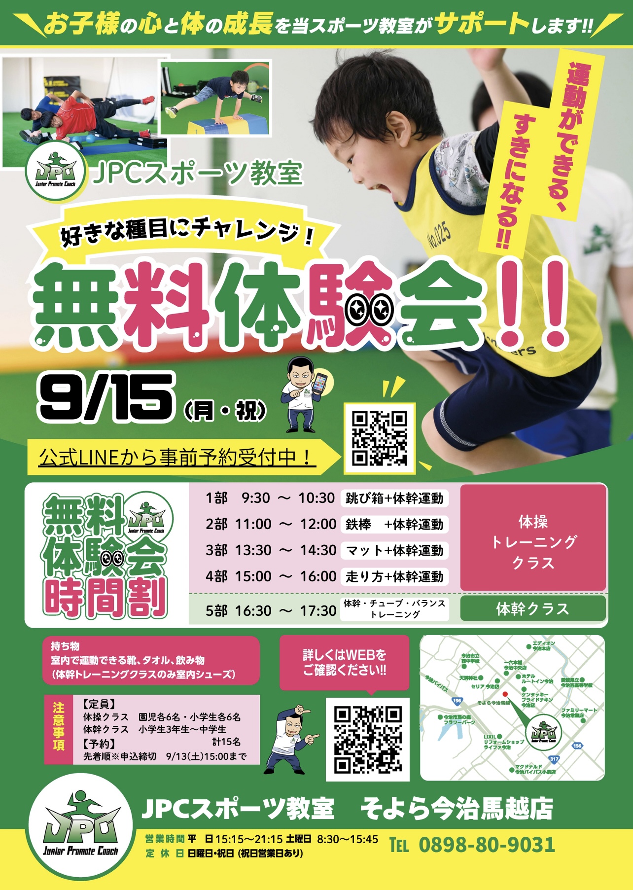 9月15日に【無料体験会】を開催いたしました‼️ 当日はたくさんの方が参加していただきました👏 体操クラスでは、普段の授業で実施しています跳び箱、鉄棒、マット運動などの体操種目を体験していただき、体幹...