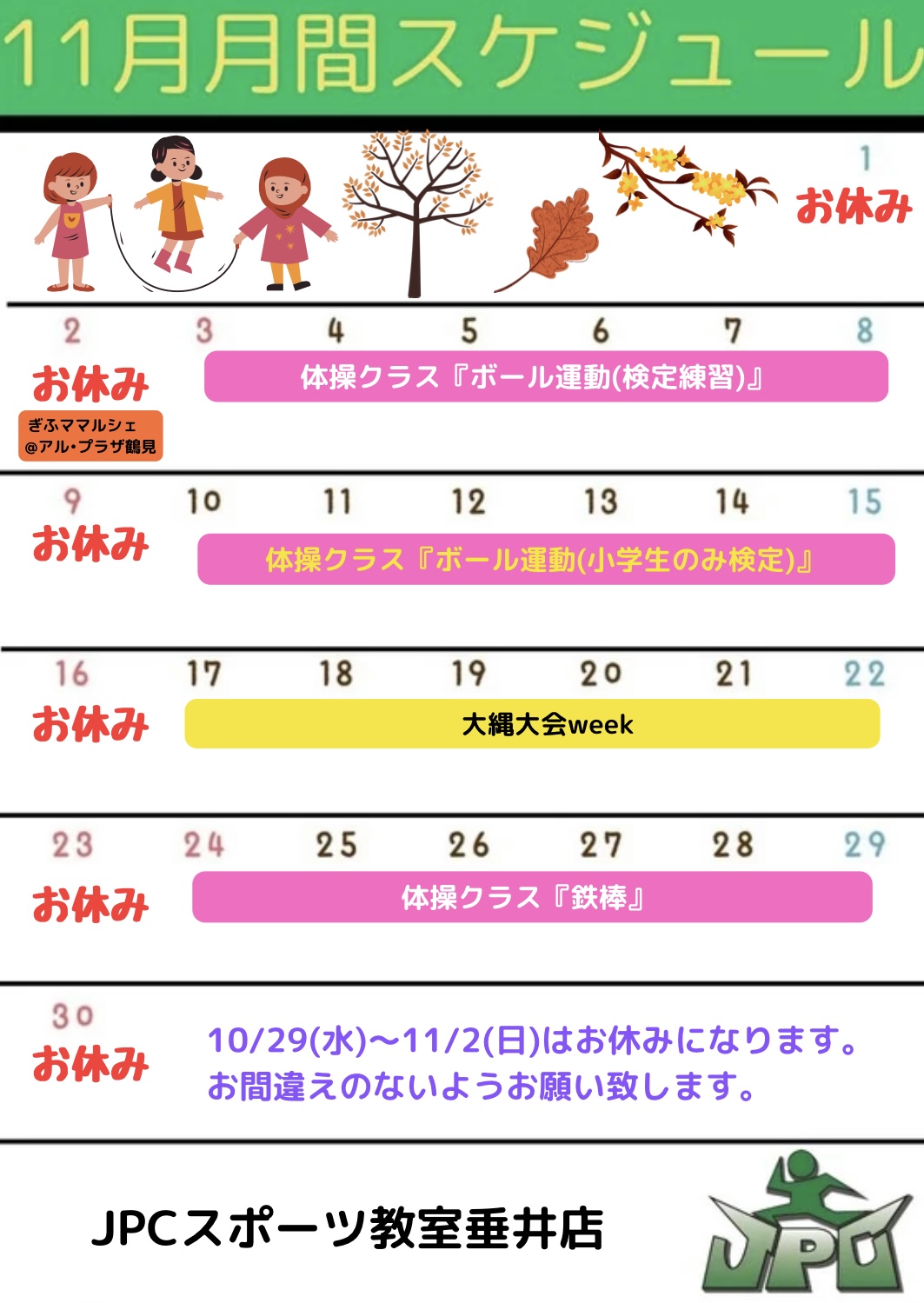 2025年の年間カレンダーと11月の月間カレンダーです。 【11月のスケジュール】 ◇体操クラスは『ボール運動』『鉄棒』 2週目には小学生のみ、ボール運動の検定を行います❗ [caption id="...