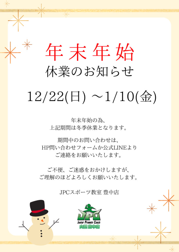 JPCスポーツ教室 豊中店は下記の期間、年末年始休業とさせていただきます。   【年末年始休業期間】 2024/12/22(日)〜2025/01/10(金) ※1/11(土)より通常営業となります  ...