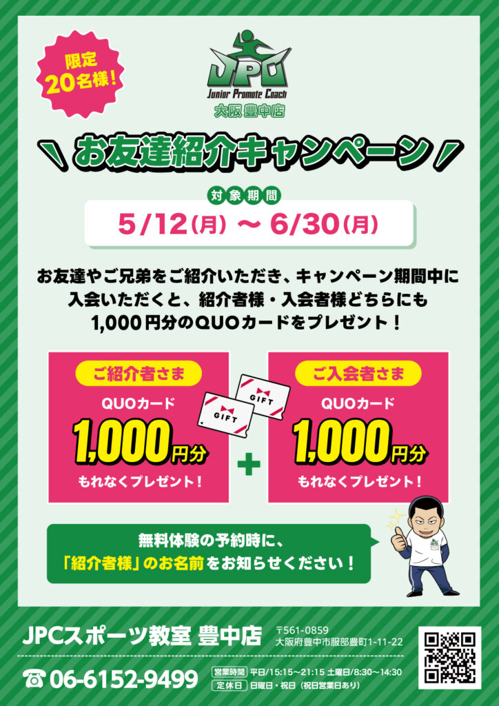 \ ✨お友だちやご家族のご紹介でW特典! ✨/   JPCスポーツ教室豊中店では、2025年6月末まで「お得な紹介キャンペーン」を開催中です!   ■キャンペーン内容 期間中、JPC豊中店の会員様から...