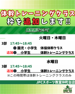 JPCスポーツ教室 横浜仲町台です!!! 今回は体幹クラスの枠を追加します。 時間割と日程に関しては、下記の通りとなります。 体操体幹クラス月2回と体幹クラス月2回の計4回に分けて通うことも可能です。